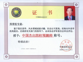 鄭青松大師易學功底深厚,精通五行術數,深得相天察地,觀砂嘗水之理,世傳風水理論,將三元、三合、玄空風水、六壬、四柱八字、姓名與人生等應用自如,是國內外知名的易學專家,姓名策劃專家,易學前輩。
